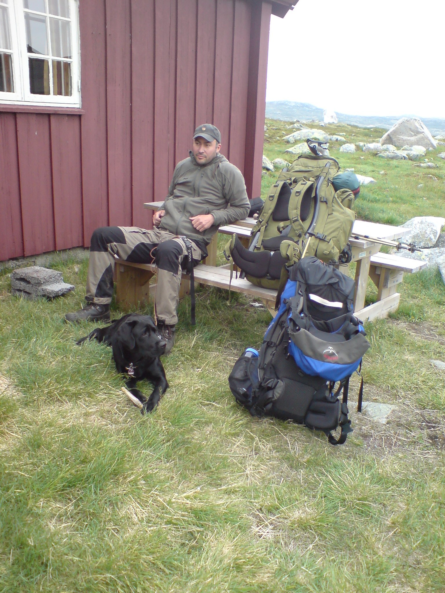 Nun kam die Frage, kann ich laufen oder nicht und wenn wie und wie weit. Julia meinte, ich solle alles Unwichtige liegen lassen und versuchen mit leichtem Gepäck weiter. Aber da war ich stur und lud nach ein paar Gehversuchen den recht schweren Rucksack (ja Hundefutter wiegt auch! 🙂 ) mit Julias Hilfe auf und es ging unter Schmerzen und im Schneckentempo in Richtung Kraekja. Dort würde ich weitersehen. Es war wirklich „sch….“ zu laufen, ich musste den Fuß absolut senkrecht aufsetzen und mit den Stöcken gut abstützen, dann ging es einigermaßen. Vorher habe ich meine Meindl Himalaya so fest geknallt, das sie maximale Stabilität im Knöchel boten. Das GPS zeigte eine Reststrecke von 3,8km und es war so eklig warm und vermückt, das diese Strecke die längste meines Lebens wurde. Ich war froh über jede 100m, die ich geschafft habe. Gegen späten Nachmittag kam Kraekja in Sicht, doch ich wartete am See mit Henk und spielten mit den Mücken, während Julia weiter zu Hütte lief und dort zu beraten, was man machen könnte. Nach einiger Zeit kam sie zurück. Der Hüttenwirt wollte wohl nur die Koordinaten wissen und einen Hubschrauber anrufen. Julia wollte dies jedoch mit mir besprechen, und wir verschoben die Entscheidung auf den nächsten Morgen. Ich war mi total unsicher, wie teuer solch ein Einsatz mit dem Heli wäre, deswegen entschied ich mich dagegen. Ich bin zwar über den ADAC bis 2600 und per Unfallversicherung bis 2500€ bei Bergungskosten versichert, aber langt das???? So entschlossen wir uns von Kraekja aus per Boot nach Fagerheim übersetzten zu lassen, das kostete entspannte 250KR. An Fagerheim liegt die Straße 7, die direkt wieder nach Haugastol zurückführt. Ein sehr netter Norweger (nochmals vielen Dank!) fuhr uns samt Rucksäcken und Hund nach Haugstol. Wir bedankten uns mit einer Flasche Weinbrand und waren heilfroh wieder beim Auto zu sein.